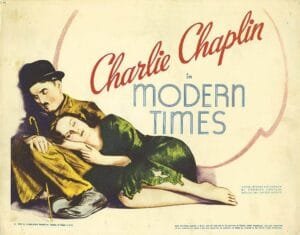 Extenuado por el frenético ritmo de la cadena de montaje, de los tiempos modernos un obrero metalúrgico que trabaja apretando tuercas acaba perdiendo la razón.